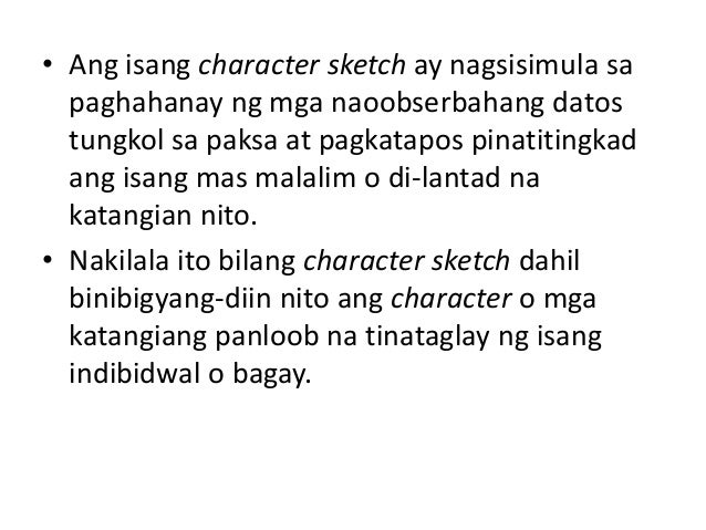 Paggawa ng isang Murderer. Hindi kalabisan na ituring siyang isang makabagong Emilio Jacinto. Character Sketch Isang anyo ng sanaysay na naglalarawan o nagsasalaysay tungkol sa isang tao hayop bagay o lugar tungo sa isang impresyon o kakintalan o kayay insight o kabatiran Dapat isaalang-alang sa pagpili ng Paksa 1.