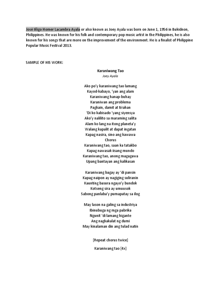 Karaniwang Tao Lyrics Joey Ayala Elyrics Net