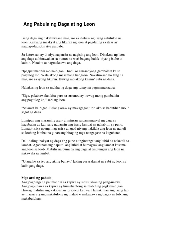 Pabula with aral maikling kwento lamang. May isang bagay na talagang lagi niyang gustong gawin kahit ipinagbabawal ng ina - ang maligo sa ilog. 10 pinakasikat na alamat sa pilipinas ang mga kwentong pabula ay karaniwang ginagamit bilang kwentong pambata kung saan ang mga tauhang hayop o bagay ay nagsasalita at binibigyang buhay na. September 1 2020.